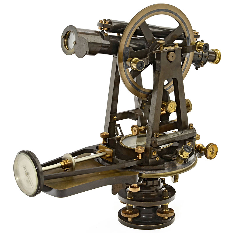 Engraved "Stanley, Great Turnstile, Holborn, London", serial no. 8343, original lacquered brass, silver scales, 4 magnifiers, 12 1/3in. telescope, height 15 in., with compass, in original mahogany case. With curve-ranger in second case.