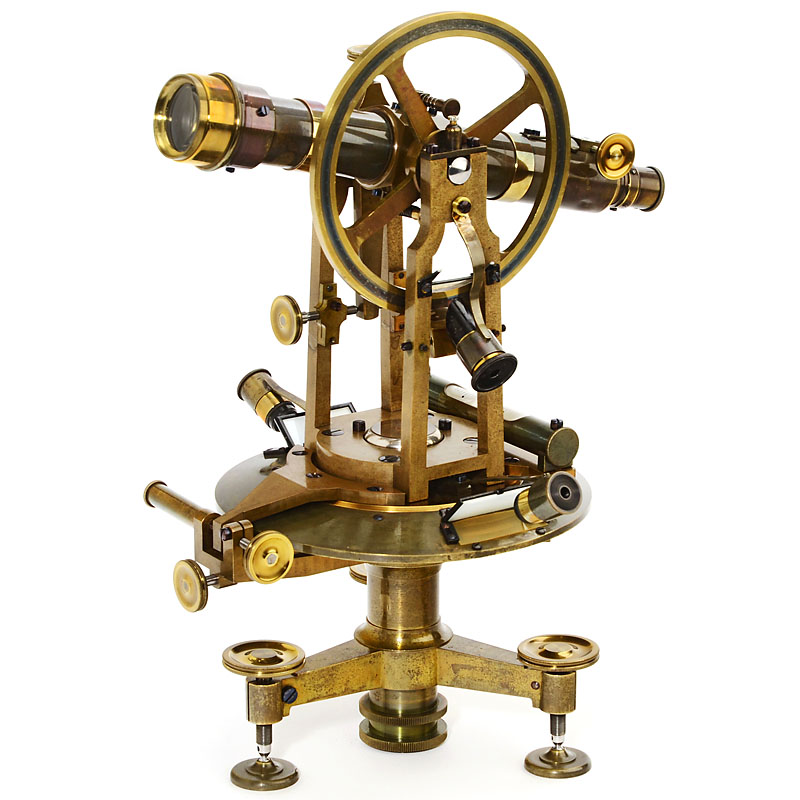 Signed: "T. Ertel & Sohn, München", no. 10650, original lacquered brass, silver scales, 3 magnifiers, 3 stick levels and 1 circuit level, telescope with rack-andpinion focusing, length: 9 ¾ in., height: 13 in. – A very well-kept instrument.