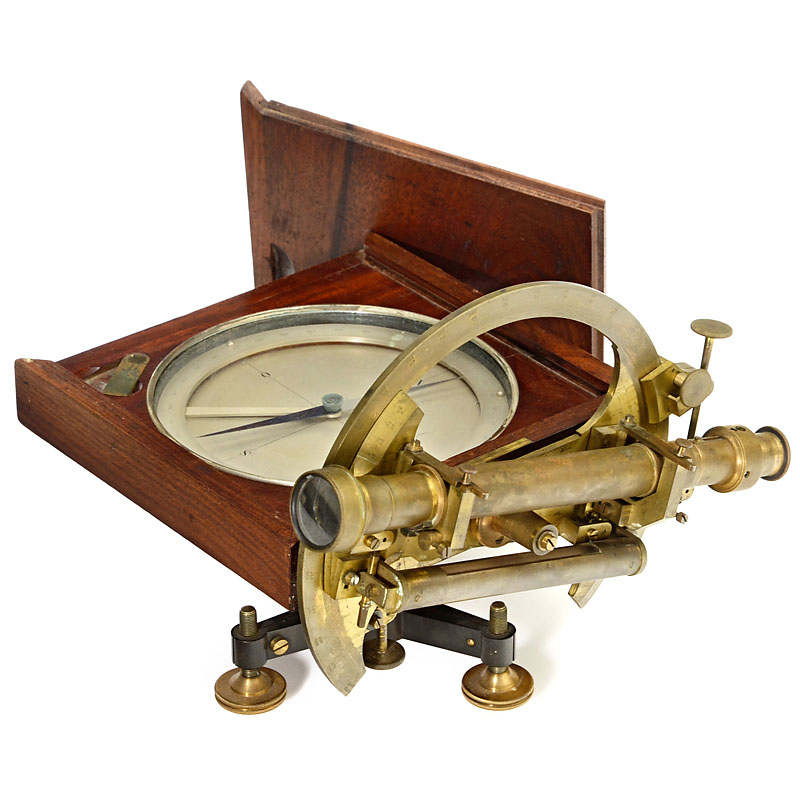 Engraved "Lenoir à Paris, Rue Cassette 14", original lacquered brass, compass with silvered scale, Ø 5 3/4in., 9 7/8in. telescope, with bubble level, on later tripod.