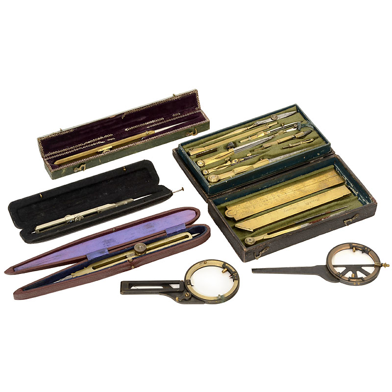 1)2 drawing protractors, 1 with folding alidade, marked "Schubert & Vialon, Berlin". – 2)3 reduction circles, brass and steel, 2 x German and 1 x English, all cased. – Und: 3)French cased set of drawing instruments, unmarked, brass and steel, lower tray with brass scale rules.