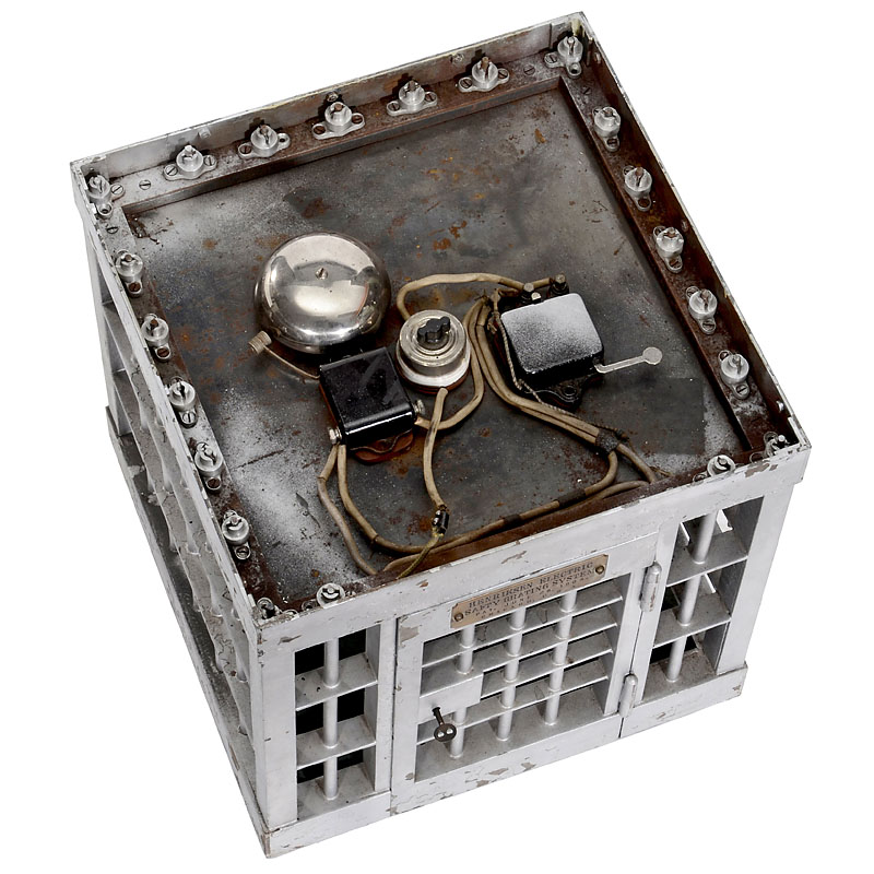 Patent No. 763890 by Gustav T.E. Henriksen, Milwaukee, 28 June 1904, painted metal case with 2 horizontal crossbars and 21 vertical tubes with sliding inner rods with electric terminals connected to alarm bell system mounted on the top, with door, lock and brass plaque engraved: "Henriksen Electric Safety Grating System, Pat. Jun. 28 1904, Chicago, USA", height 16 in. (41 cm) x width and depth 16 ¼ in. (41,5 cm). In original metal transport case. Henriksen filed his patent application for "improvements in safety-gratings" on 2 December 1903. The object of his invention was to "prevent the severing of grating-bars and togive an alarm in case of an attempt to do so". It features an arrangement of vertical tubes encasing revolvable rods suspended from notched collars at the upper ends and connected to electrical terminal at the lower ends. The rods are held loosely in their collars by cross-pins. Attempting to cut through the outer tube rotates the inner rod, the pin drops into the notch in the collar and the lower end of the rod engages with the electrical terminal, which closes the circuit and activates the alarm. Included with the model are copies of the original patent application, patent, a 1910 patent by Henriksen for "Oiling Devices" and related papers. A fascinating exhibition piece!