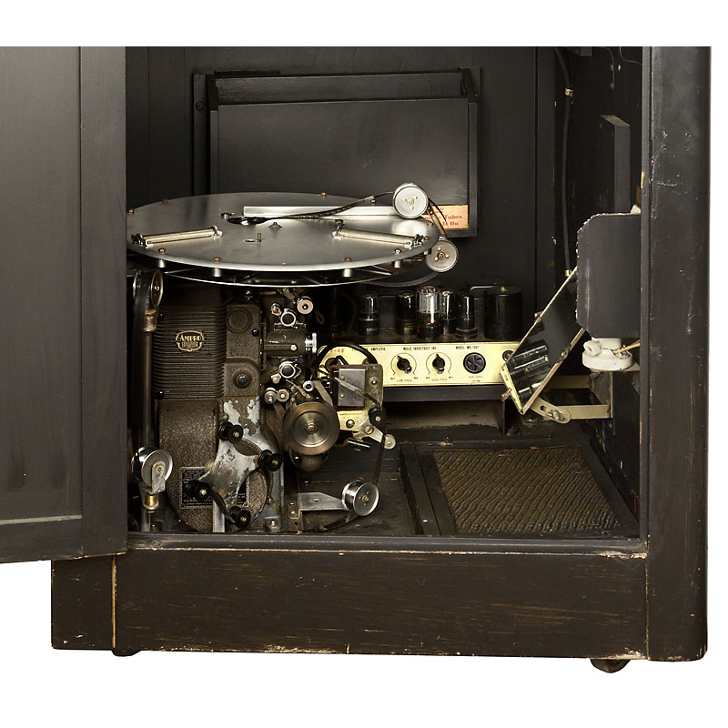 Mills Panoram successor. Sensationally rare film musicbox with superb entertainment value and a giant movie title offer of international vocal and orchestra performers, up to sport events (famous box matches etc.), animated cartoon films and "noble" sex films! An extensive title index of all produced movies was published in book form (here not included). – Original movies are available permanently on eBay for reasonable 20—80 Euro each. So it's easy and inexpensive to create your own personal program! – Manufacturer: Mills Novelty Co., USA. With 1 title on 16mm continuous film on endless spool, 110 V, good working condition. – The grandfather of all video clips!