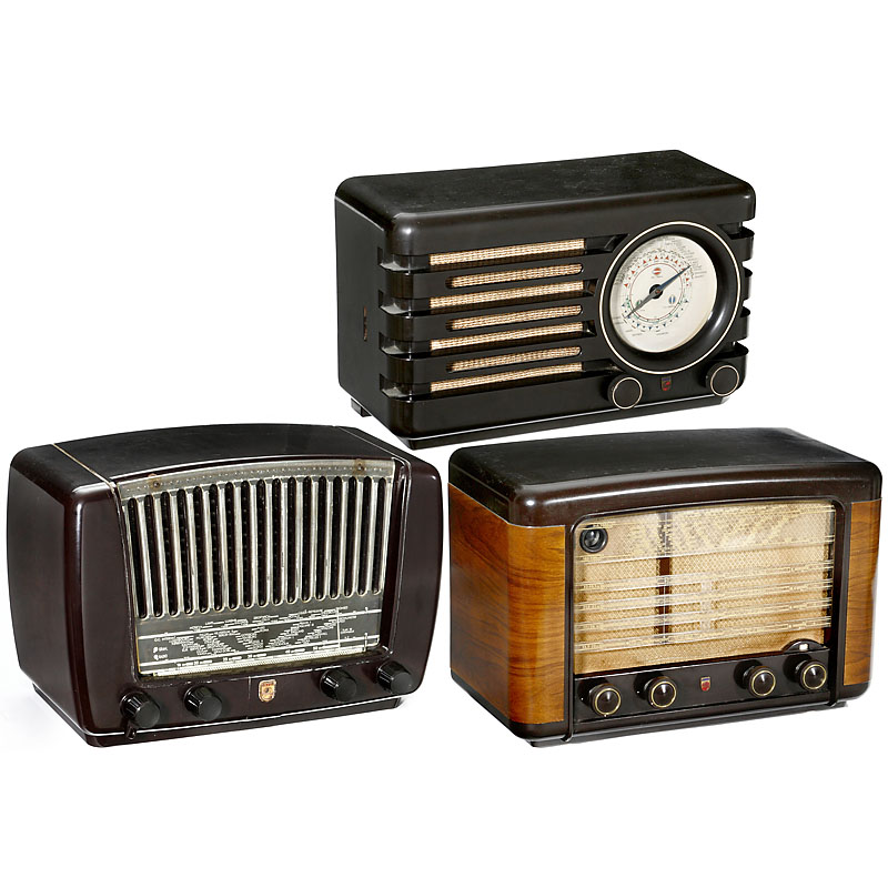 1) Model 490A, long, medium and 4 short wave ranges, bakelite and wood case. – 2) Model BX373A, long, medium and short wave, bakelite case. – And:3)Model BX310, long, medium and short wave, bakelite case.