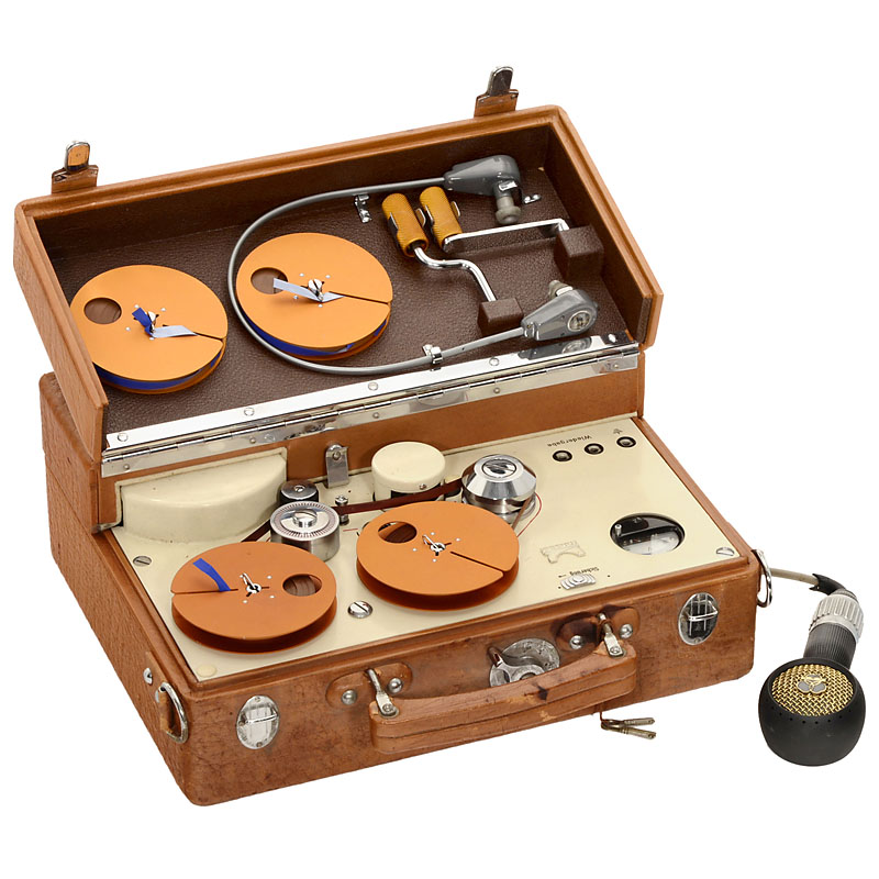 Manufacturer: Maihak AG, Hamburg. Portable reporter recorder, full-track, for dry batteries, clockwork drive, speed 7 ½ in. p/s. With AKG microphone.