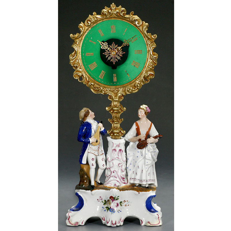Verge movement by Gottfried Torbach, Munich, figural porcelain base, green glass dial with gilt Roman numerals, brass dial frame, rear with candle holder, overall height 15 in., working.