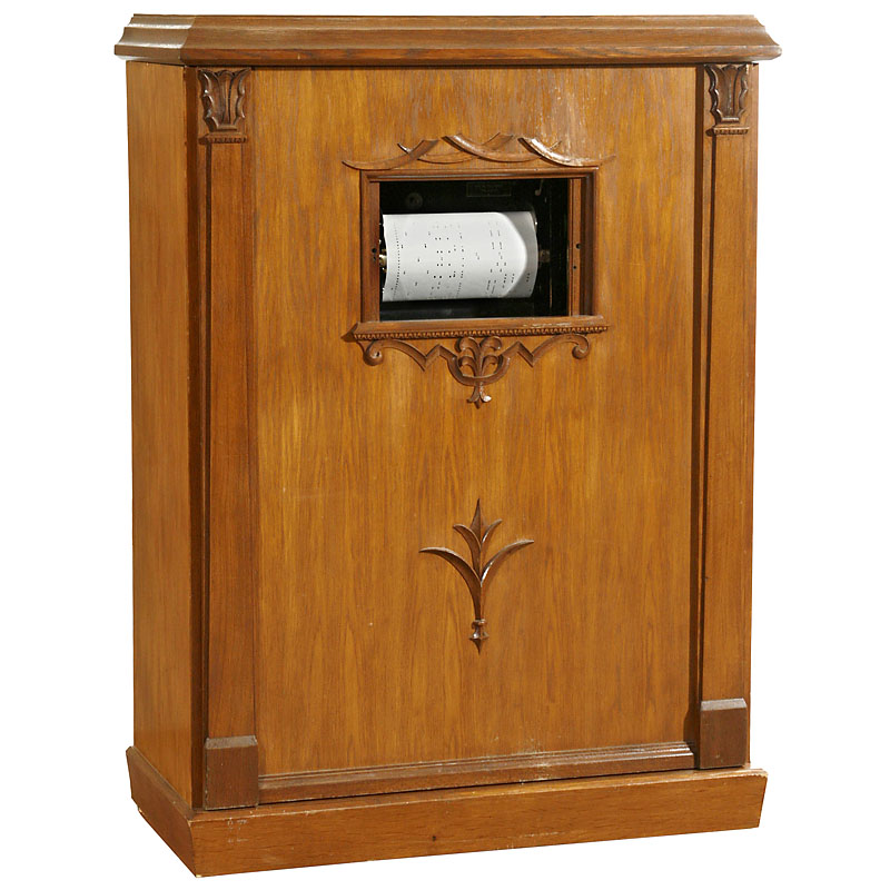 By Ludwig Hupfeld AG, Leipzig, model without keyboard; with piano, harp-effect (not complete) and 10-note orchestra bell set; size 45 x 22 x 62 in. Excellent playing condition.