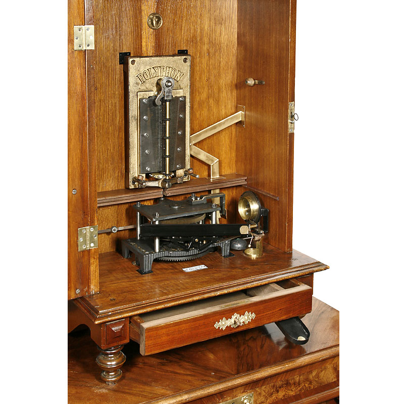 Manufactured by: Polyphon Musikwerke, Leizpig, for 19 ¾ in. discs, with 118 tooth steel comb (complete), coin-operated, with token price award, walnut case, base and top added, overall height: 82 in. Very good restored condition, plays excellently. With 34 discs.