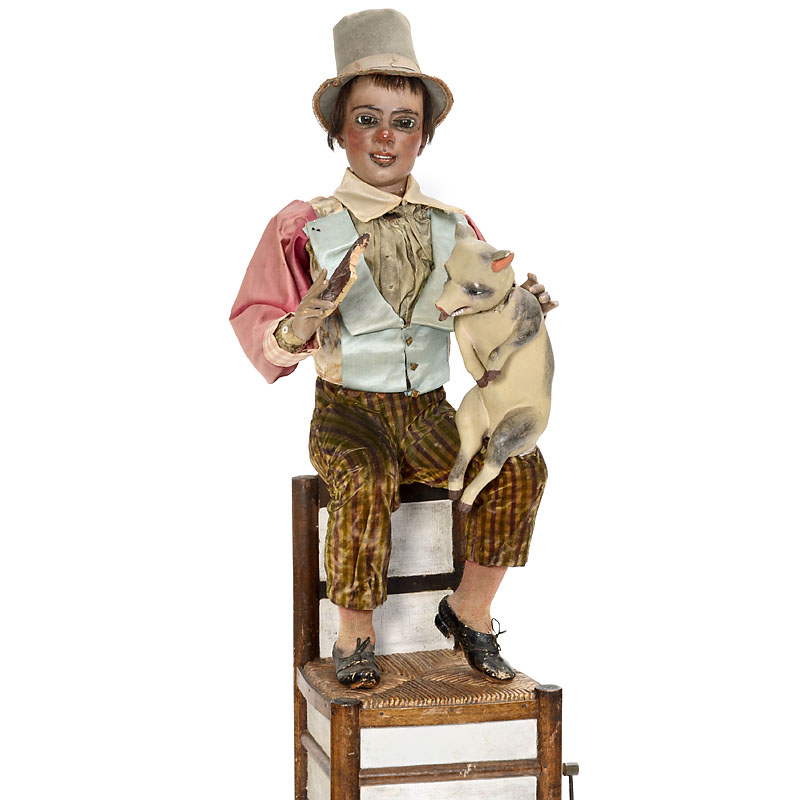 foot and heaves his shoulders in laughter. – The automaton is presented with two costumes: a second generation smock and checked trousers plus the original satin