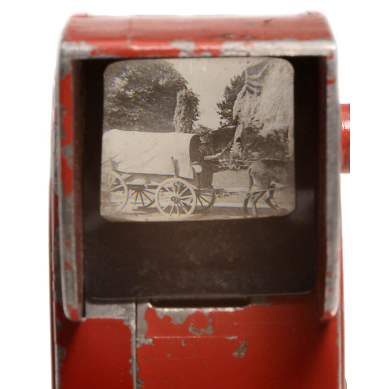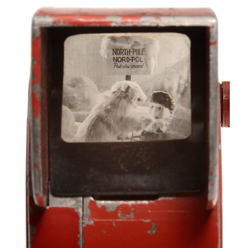 Small German mutoscope by an unidentified maker, Ø 4 in., for 1 in. pictures. With 6 original reels. 1) "Hein Ten Hoff boxt". –2) "Eiskunstlauf Maxi und Ernst Baier". – 3) "Das Seifenkisten-Rennen", "Das große Rennen" and "Der Sieger". – 4) "Der kluge Bär