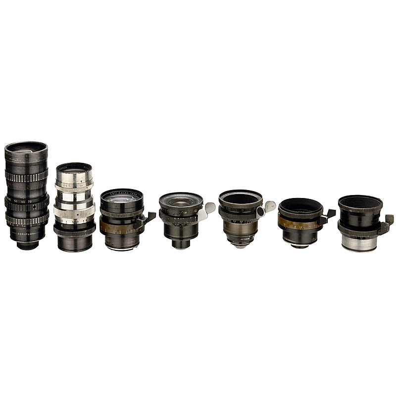 Arriflex 16 and Arriflex 35 Standard mount, some defective. 1) Schneider Cinegon 1,8/10 mm. (4/5) – 2) Rodenstock Heligon 1,5/25 mm. (4+/4+) – 3) Zeiss Jena Biot. (Biotar) 2/3,5 cm T. (4-/4-) – 4) Zeiss Jena Sonnar 1,5/5 cm T. (4/5) – 5) Zeiss Jena Sonnar