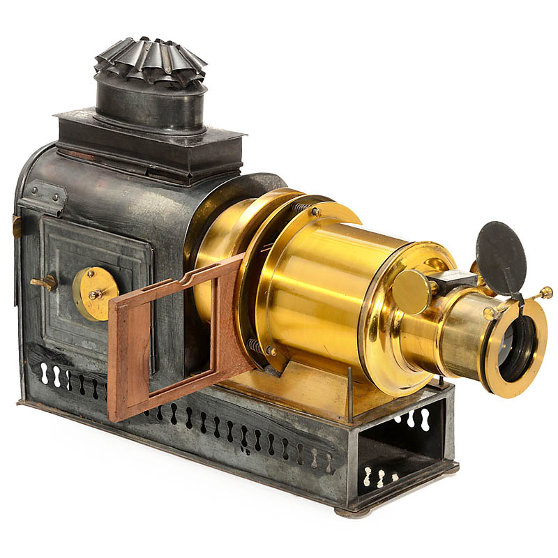 England, "Sunday School"-type lantern with lacquered 1 in. brass lens, condenser, four-jet "Improved Stocks-Wrench Lamp" spirit illuminant and simple slide-carrier, height 12 ½ in. (32 cm), length 17 in. (43 cm). Good original condition!