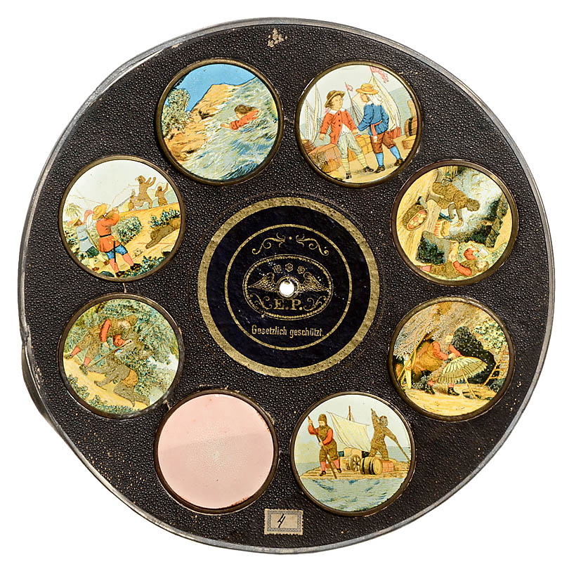 Nuremberg. With architectural decoration on lens-standard, height 10 ½ in. (27 cm), no illuminant, paint loss on lamphouse, otherwise good. – Add-on: Rare Ernst Plank card picture disc with 7 circular slides of Robinson Crusoe, Ø 8 ¼ in. (21 cm).