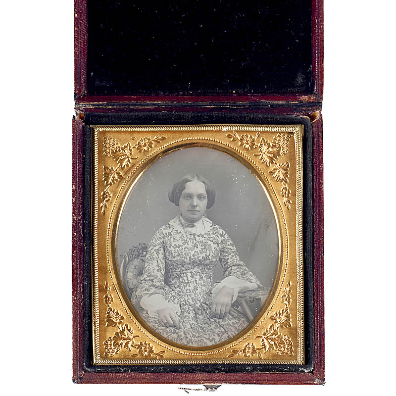Presumably England or America. 1/6 plate, portrait of a lady, colored, excellent illumination and condition, brass passe-partout with floral ornaments, in case.