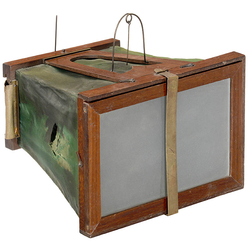 Deyrolle, France. Ingeniously constructed and famous strut-design camera, invented by the Belgian Dr. Ernest Candèze (1827–1908), 13 x 18 cm. Rigid lens board, unmarked brass lens, gilt-stamped green leather bellows. Partly restored, focusing screen back.