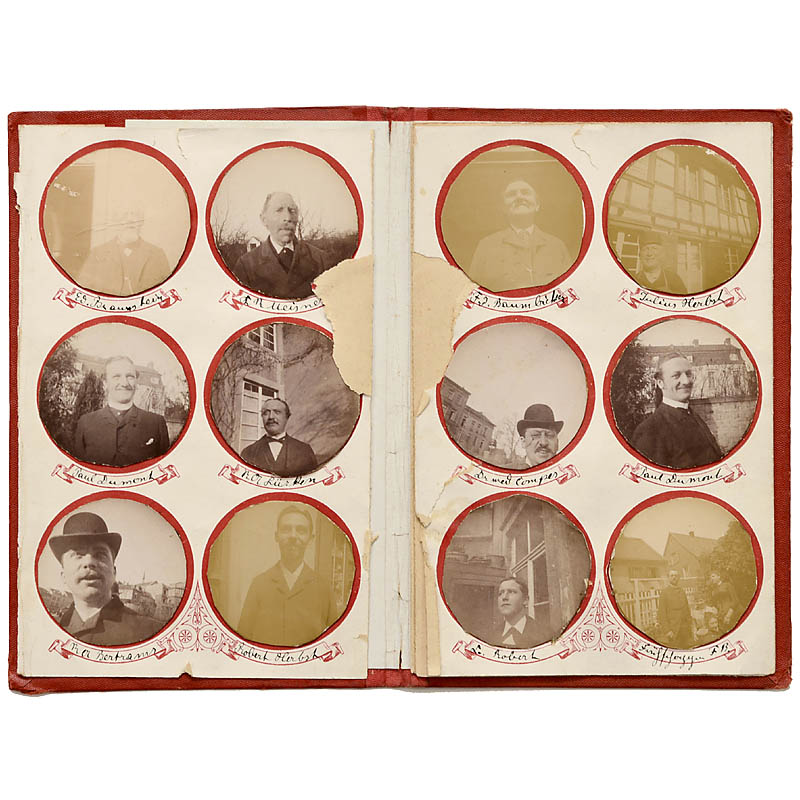Original photograph album for round pictures, album with 12 original prints, size of the album: 4 ¾ x 6 ¾ in., pages loose. Extremely rare Stirn accessory!