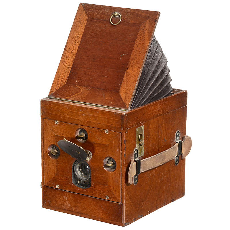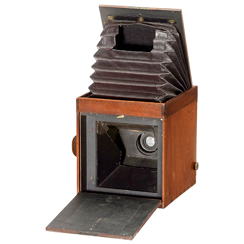 Tourtin, Paris. Rare French SLR camera for plates with size approx. 10,5 x 10,5 cm. This version is not mentioned in any literature! Tropical wood with brass fittings, lens: Zeiss/Krauss Paris Anast. 8/136 mm. Special shutter coupled to the mirror.