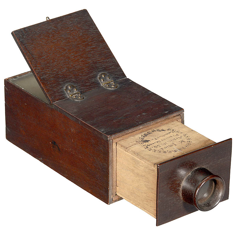 M. Jones, England. Mahogany, size 11 x 4 1/3 x 3 ½ in., with lens and flap, focal length approx. 16 cm, sliding-box focusing system, screen size 4 x 4 in. With original wood-bound lens. In very good unrestored original condition!
