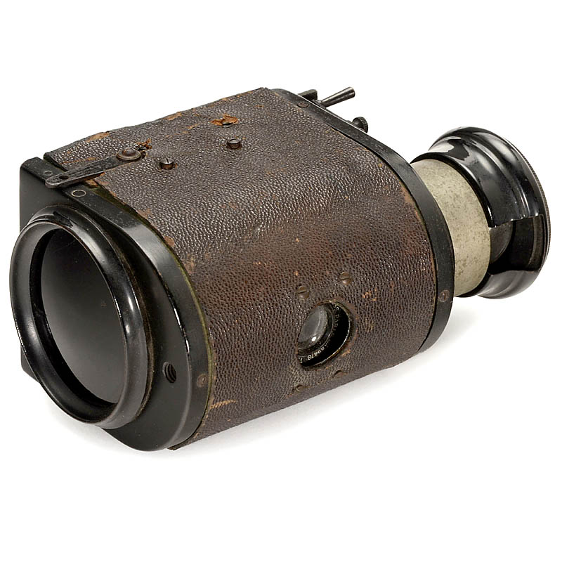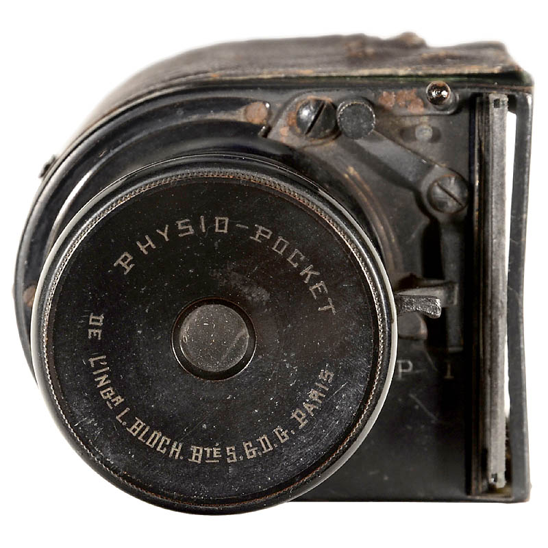 Bloch, Paris. No. 1506, plate size 4,5 x 6 cm, with Tessar 4,5. Very rare detective camera, disguised as a monocular, with detective right-angle viewer in eyepiece, shutter I + P (stuck). Camera needs much attention.