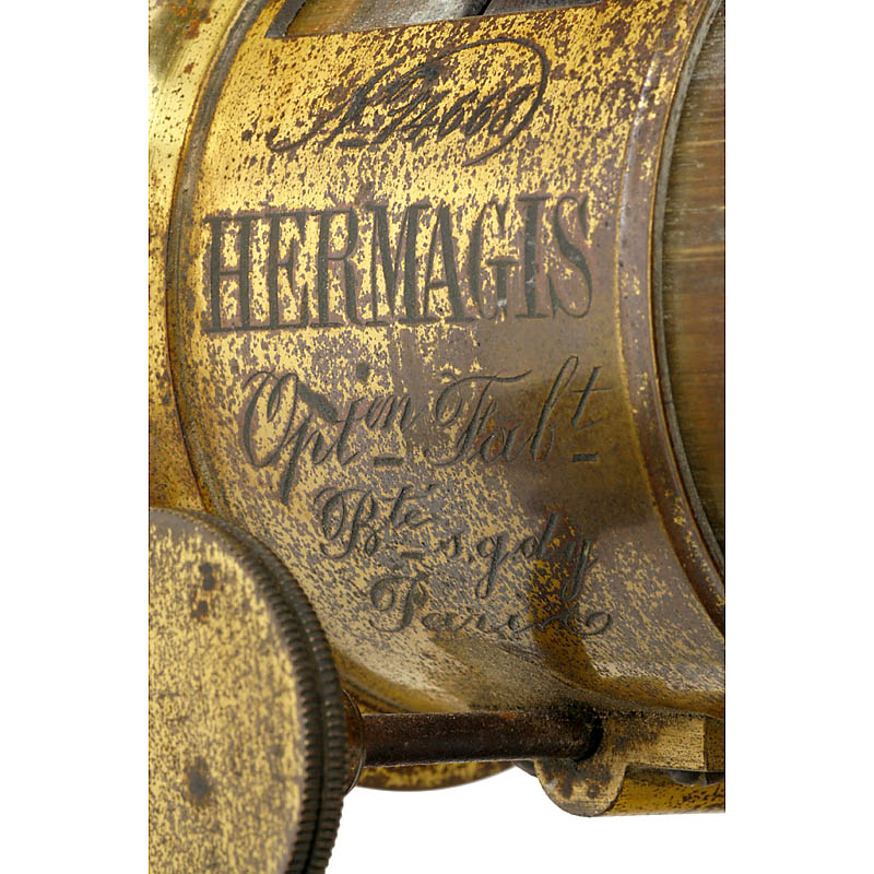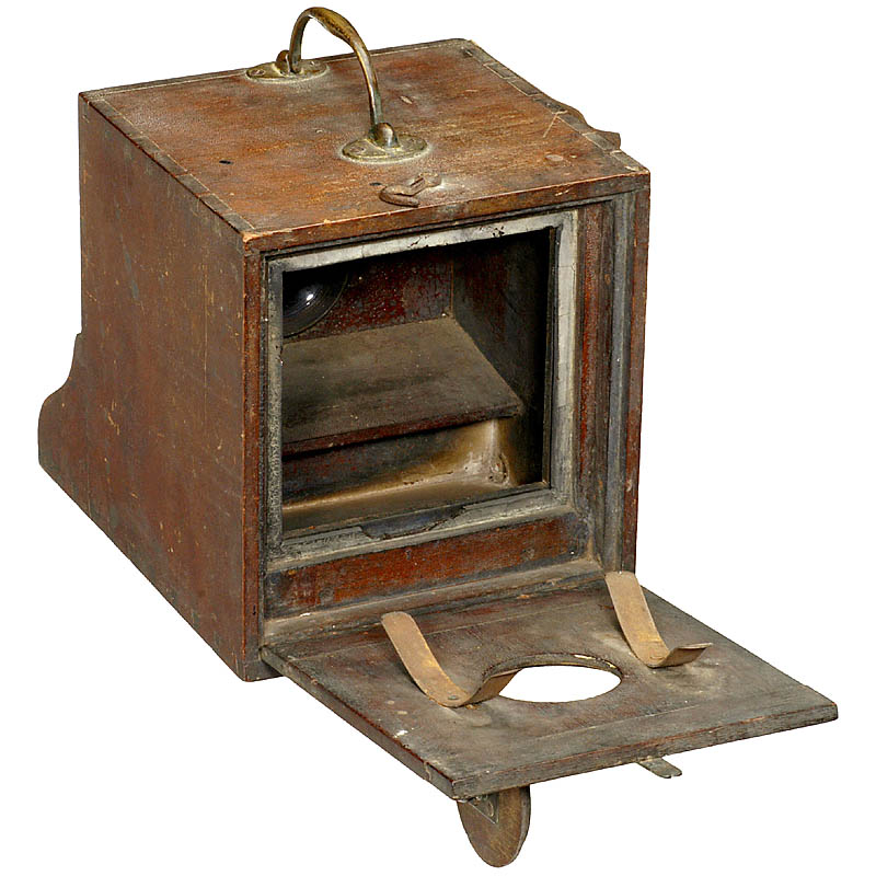 Wooden box camera for wet collodion process. The preparation of the plate took place inside the camera. The plate was pressed against a rubber seal by a metal spring clip. The chemicals entered – Dubroni-like – the camera through a rubber tube at the side