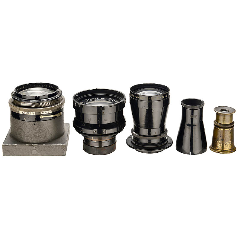 1) Ernemann. Ernostar 2/14 cm, no. 165362, chips on the optics, grey mount. (4/4-) – 2) Schneider, Kreuznach. Tele-Xenar 5,5/36 cm, no. 199087, connecting ring, height 4 3/4 in. (3-/4) – 3) Schneider, Göttingen. Xenon 2/12,5 cm, no. 44945, height 10 cm, Ø
