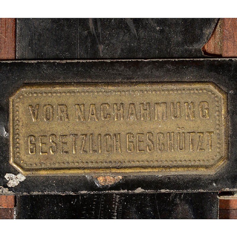 Unmarked, with extra plaque on lens board: "Vor Nachahmung gesetzlich geschützt". Plate box, plate size 7 x 10 cm, polished wood, falling plate shutter, diaphragm slide, unmarked lens. With one double cassette and focusing screen back (without glass). Suc
