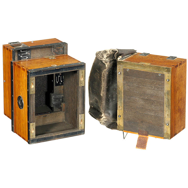 Steinheil, Munich. Design in process, still without lens and shutter. Interchangeable magazine for 6 x 9 cm plates, parallax compensation by shifting the front, for portrait and landscape formats. Made in especially light-weight material, obviously design