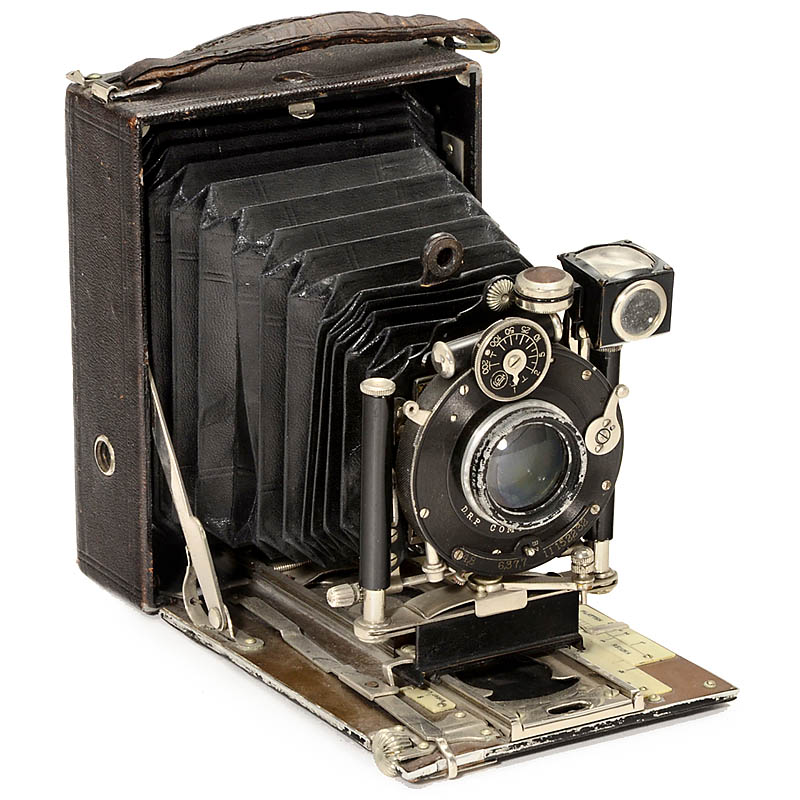 Rietzschel, Munich. Folding-bed camera 9 x 12 cm, Anastigmat Serie No. 0 4,8/12 cm in Compound, focusing screen back.