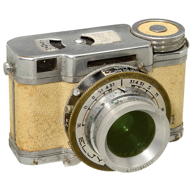 Lumière, Lyon. Subminiature camera for 24 x 36 mm exposures! Lypar 3,5/40 mm in Atos shutter, extinction meter. With original Lumière green filter. – Colored model with yellow covering.