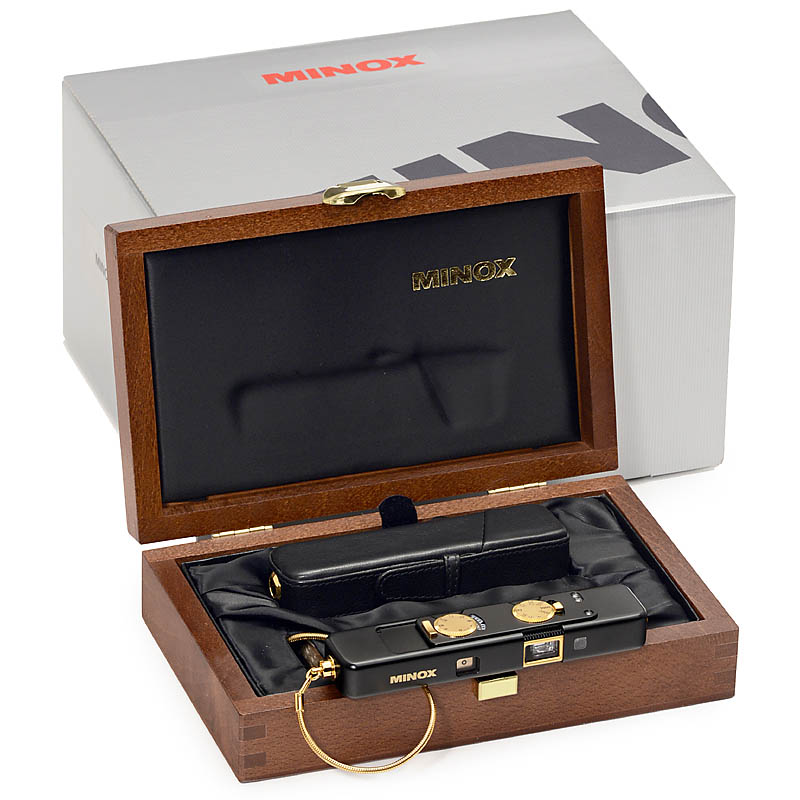 Minox, Gießen. No. 2603522. Sales no. 60677. Black/golden edition, in fitted wood case. Like new!