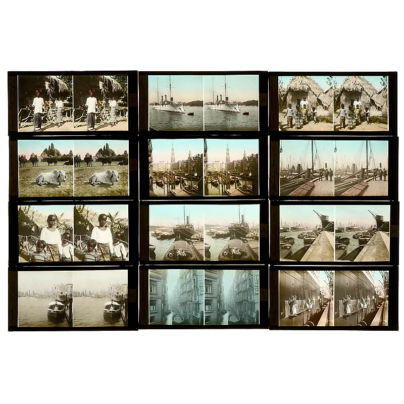 A rare combination, used for glass stereo slides of 9 x 18 cm, lid with buildt-in graphoscope (suitable for multiple sizes), paternoster system, for 60 stereo slides, focusing lenses, ebonized wood case with incised gilt decoration, size 12 x 12 x 18 ½ in