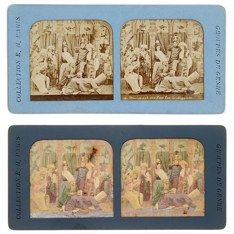 "Collection E.H. Paris". Early set with 12 cards from the series "Groupes de Genre", series "Dumanet au Serail". With original cardboard box.