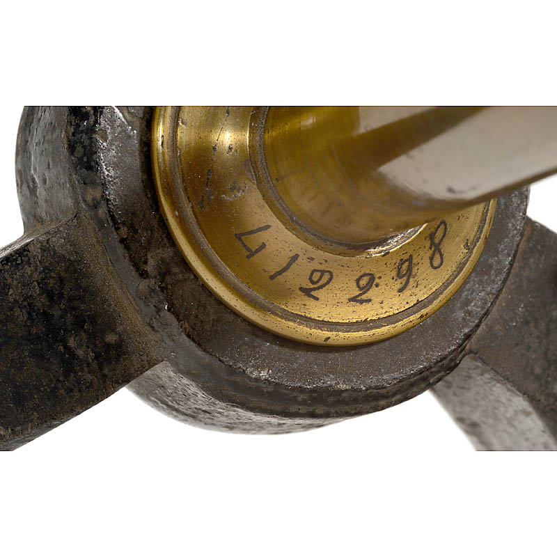 Unmarked, presumably Jules Duboscq. No. 412298, viewer with two adjustable prisms, size 25 x 30 mm, blackened-brass prism box, wooden viewing window, brass/iron stand with adjustable head.
