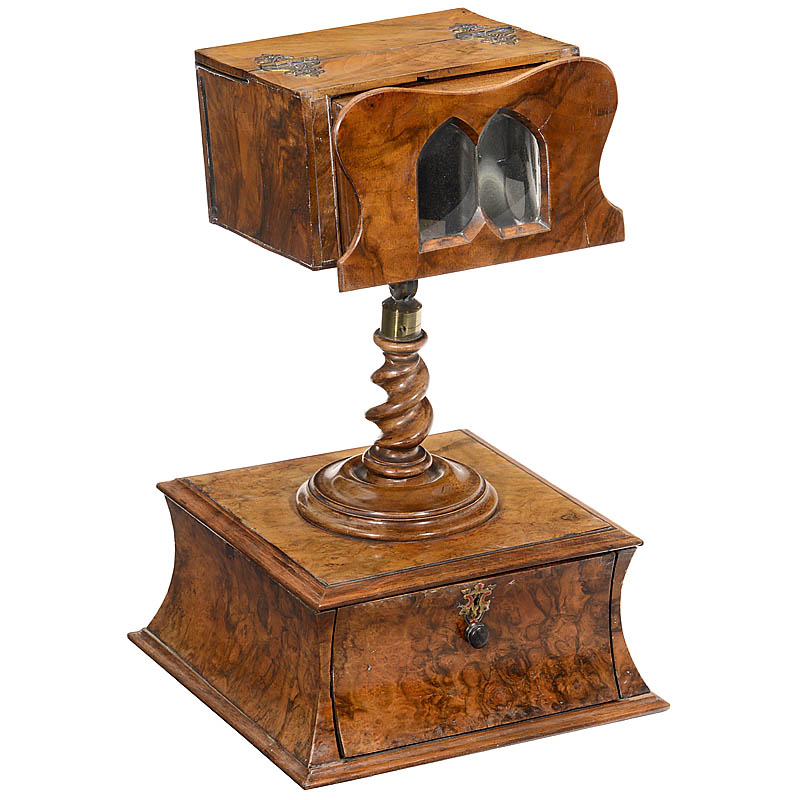 "George Knight, London", early English table-top stereo viewer, for 9x18cm slides and photos, sliding prismatic lens section with Gothic Revival frame, burr-walnut-veneered case, on brass mount, with barley-twist collumn and base cabinet with storage draw