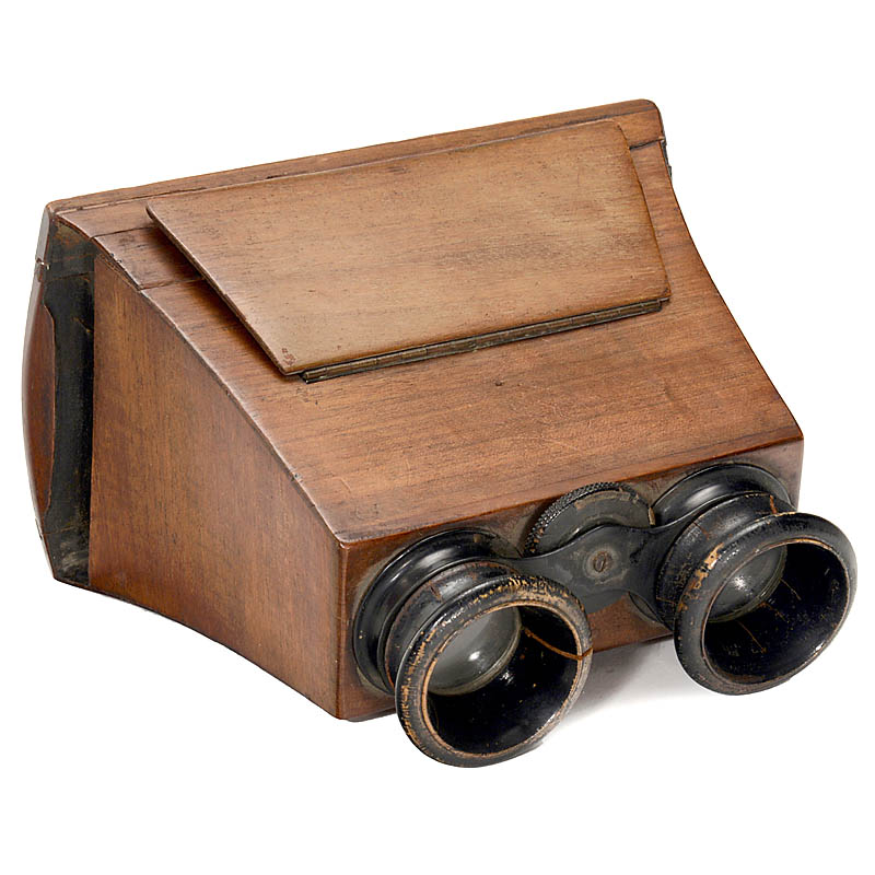 Bellieni, Nancy. Plate size 2 x 8 x 9 cm, 2 x Zeiss Jena Protar 8/110 mm, pneumatic 6-speed shutter, with front shift. – Add-on: Stereo viewer for 9 x 18 cm slides and stereo cards, complete with mirror.