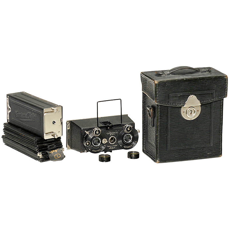 Contessa-Nettel/Zeiss Ikon. size 45 x 107 mm, 2 x Tessar 6,3/5,5 cm (1289217 + 1289218), Stereo-Compur, focusing screen back by Zeiss Ikon, interchangeable magazine by Contessa-Nettel, plates – Excellent condition, near new! – With original case.