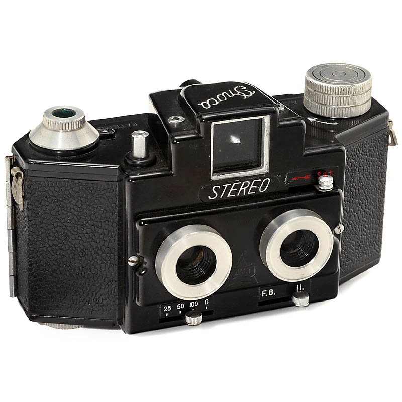 Morita, Japan, image size 28 x 28 mm on 35 mm rollfilm, plastic body, single-element lenses, fixed focus, pinhole diaphragms 8 and 11, shutter B, 1/25, 1/50, 1/100 sec., magnification of viewfinder 1:1.