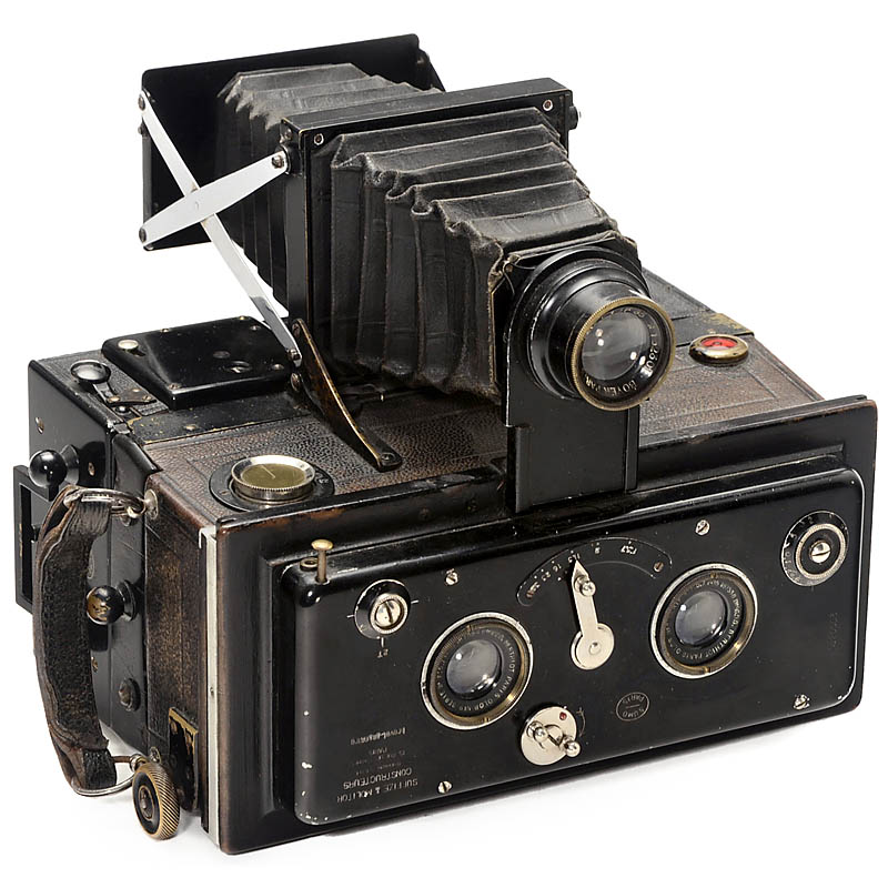 Suffize et Molitor, Paris, image size 6 x 6 cm on plates of 6 x 13 cm, Berthiot Paris Olor No. 2 Serie IIa 5,7/85 mm lenses, Boyer Topas, in bellows viewfinder, shutter 2 sec. to 1/150 sec. (long speeds are too short), magazine for 12 plates 6 x 13 cm.