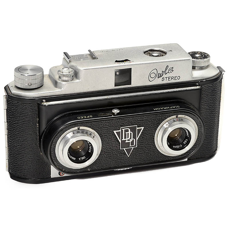 Owla Optical Co., Japan, first model, for 24x23mm exposures, Owla Anastigmat 3,5/35mm lenses, shutter B, 1/10–1/200 sec., Japanese answer to the Realist format. – Literature: W. Weiser, "Stereo Cameras Using Film", p. 86.