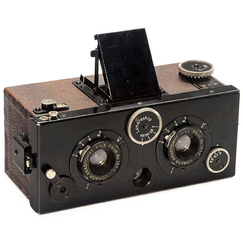 Lomarawerk W.D. Kuchn, Berlin, image size 40 x 40 mm on rollfilm 127, Lomara Anastigmat 4,5/6 cm lenses, pinhole diaphragms 4,5; 6,3 and 9, shutter Z (= B), 1/25 sec., 1/50 sec., 1/100 sec., reflex viewfinder with mirror for eye-level viewing.