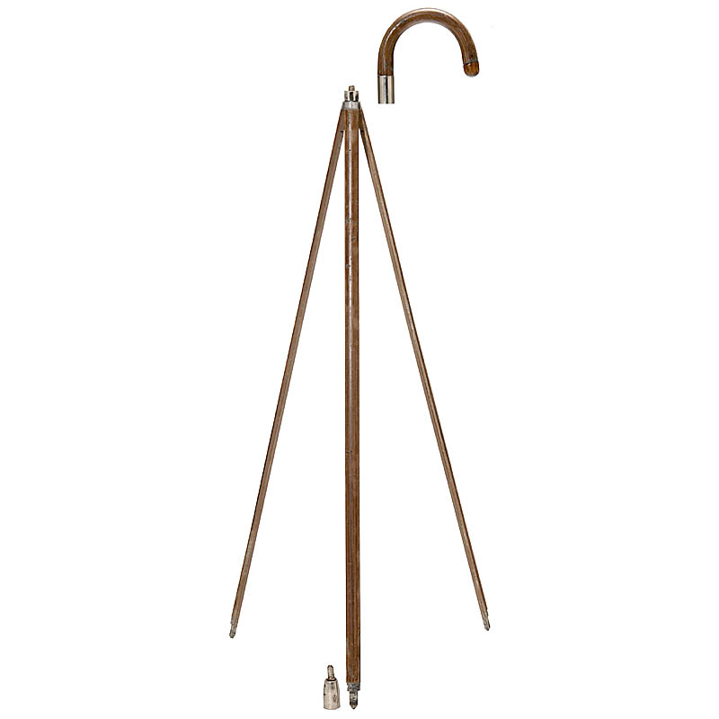 Unmarked. Collapsible, length 31 ½ in., sought-after tripod!