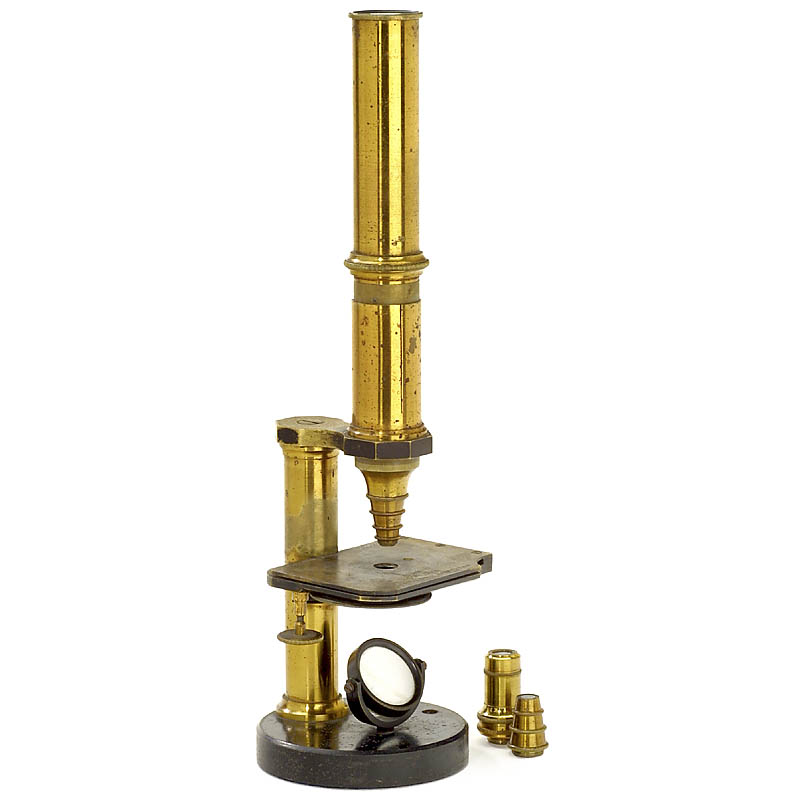 Serial no. 135, lacquered brass, circular black iron stand with additional mounting hole. Original mirror. Objectives no. 1, 2 and 3 (no. 2 is cylindrical). Height 11 ½ in. Wooden box. Engelbert u. Hensoldt were the founders of the optical industry in Wet