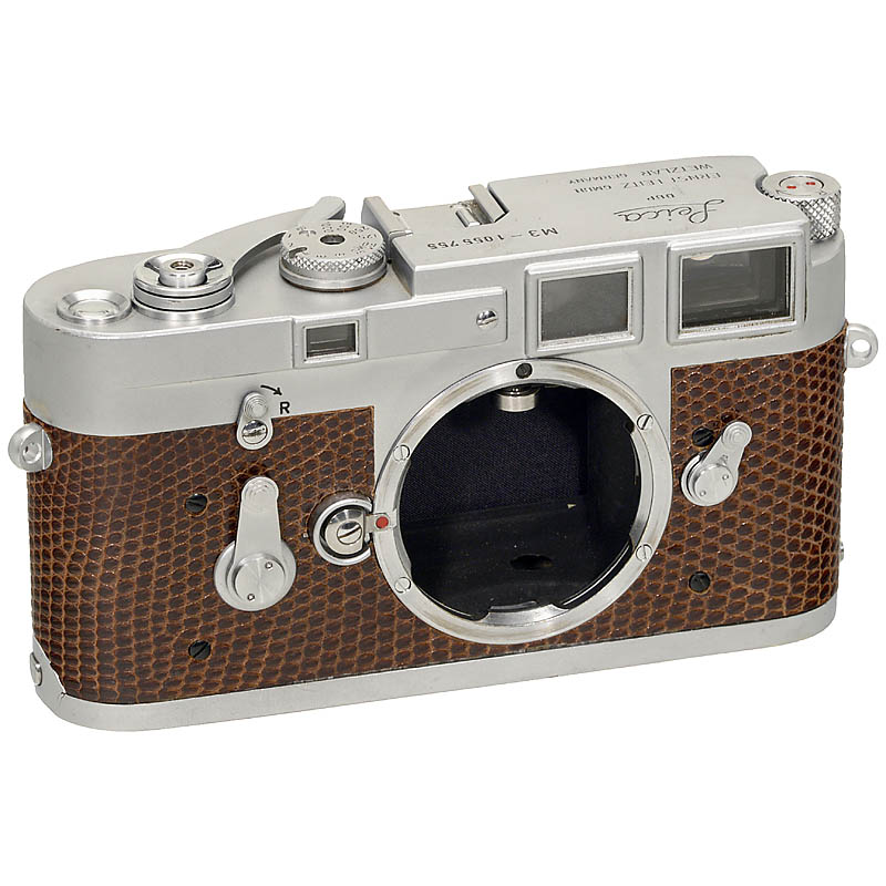 Leitz, Wetzlar. No. M3-1055755, single-stroke advance, internal baseplate missing. Cosmetically enhanced by snake skin covering.