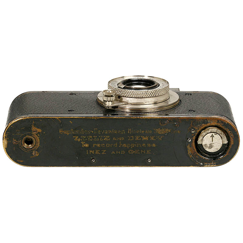 Leitz, Wetzlar. No. 41825 (5 digits!), standardized lens-mount, baseplate with original engraving, probably a wedding gift (17.09.1931). With Elmar 3,5/50 mm, nickel, metric, square release knob.