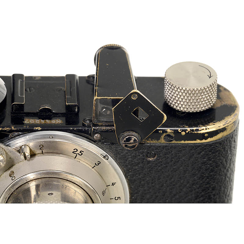 Leitz, Wetzlar. No. 44297, factory-converted to standardized lens mount, with very rare swing-out viewfinder mask for 135 mm. With Elmar 3,5/5 cm, nickel, standardized, no infinity lock. Cross reference: See following lot for Leitz Elmar 4,5/135 mm lens w