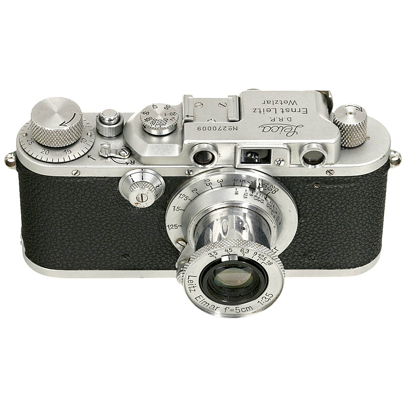 Leitz, Wetzlar. No. 270009, optically and technically in most excellent condition. With Elmar 3,5/5 cm, metric, with bakelite cap.
