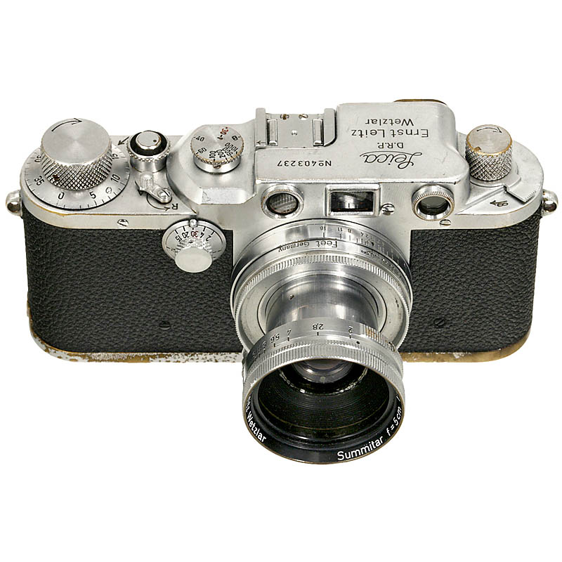 Leitz, Wetzlar. No. 403237, vulcanite renewed, brassing, technically excellent. With Summitar 2/5 cm, no. 626941, feet scale.