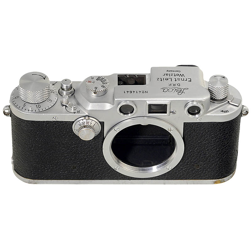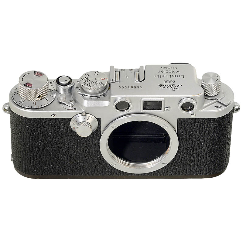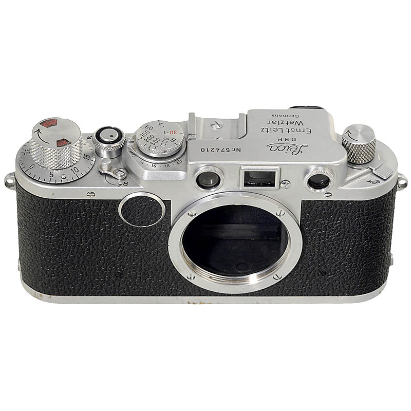 Leitz, Wetzlar. 1) Leica IIIc, no. 414641, 1946, accessory shoe missing. (4/3-) – 2) Leica IIf, no. 574210, 1952, black dial, speed sequence 30/40/60. (3+/3+) – And: 3) Leica IIIf, no. 591444, 1951, black dial, speed sequence 25/50/75, baseplate missing. (4/3) – Worth restoration!