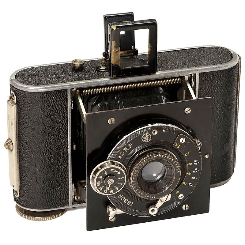 Franz Kochmann, Dresden. 1) Reflex-Korelle (II), 1936, SLR 6 x 6 cm, focal plane shutter (sticks and uneven), Radionar 2,9/7,5 cm. (3/4) – And: 2) Korelle 3 x 4, 1931, strut-folding type, size 3 x 4 cm, Trioplan 4,5/5 cm in Ibsor (too slow). (3/3-) – Soug