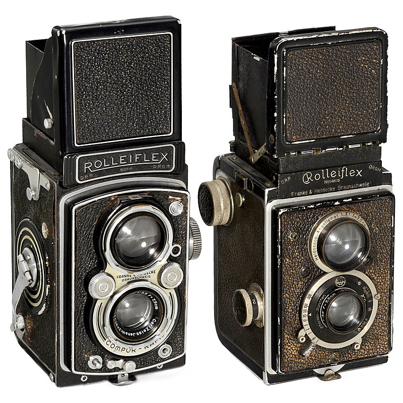 Franke & Heidecke. 1) Rolleiflex 3,8, 2nd version, 1929, no. 54635, Tessar 3,8/7,5 cm in Compur (long shutter speeds uneven), no. 1129584, with case. (3–4/3) – And: 2) Rolleiflex Automat, 1939, no. 902514, 3rd version, Tessar 3,5/7,5 cm, no. 2495235. (3/3