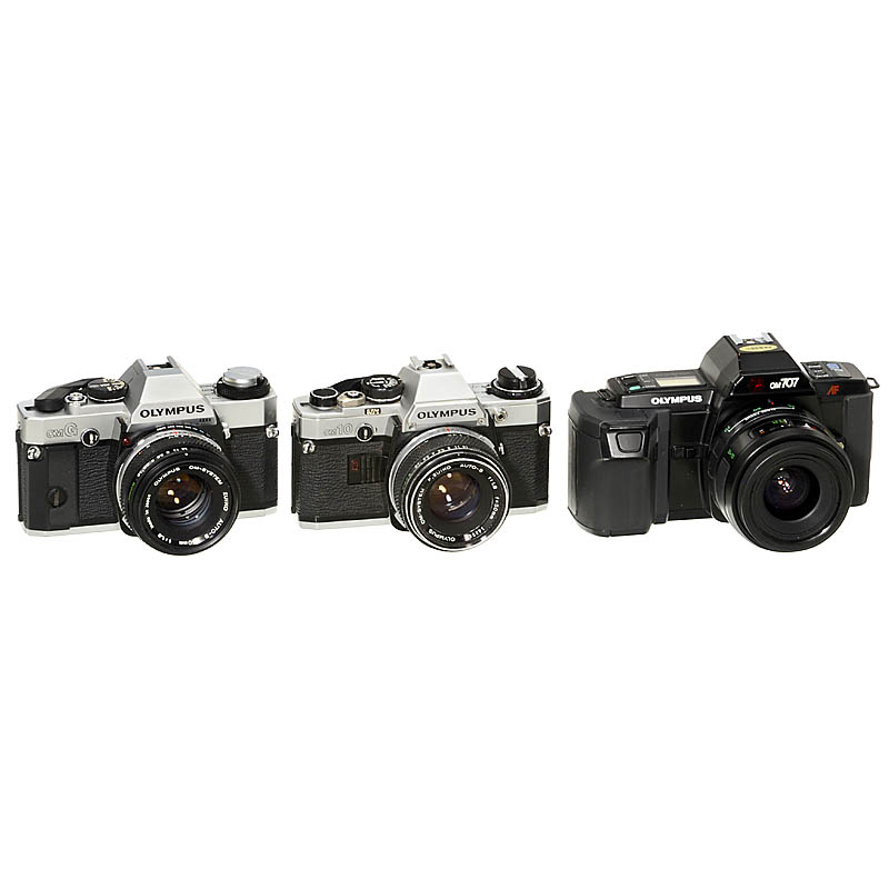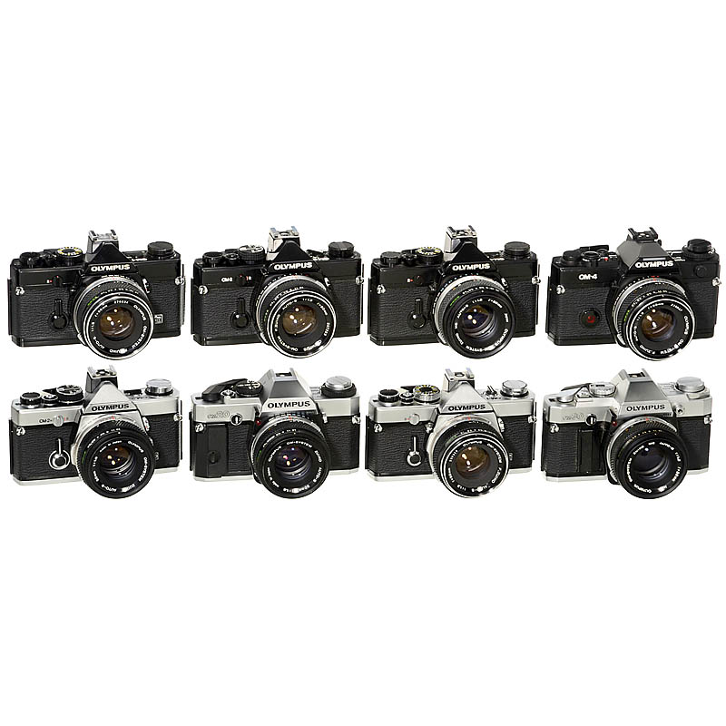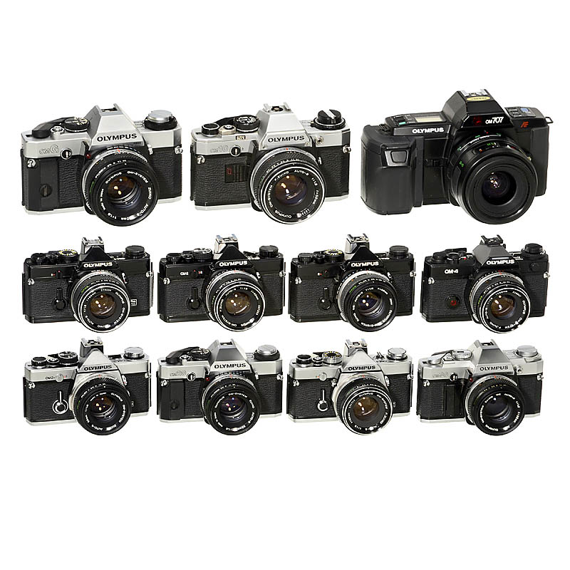 Olympus, Japan. 1) OM-4, black. – 2) OM-2N, chrome. – 3) OM-2, black. – 4) OM-1N, black. – 5) OM-1, black. – 6) OM-1, chrome. – 7) OM-10, chrome. – 8) OM20, chrome. – 9) OM30, chrome. – 10) OMG, chrome. – 11) Olympus right-angle finder 1,2 x 2,5x. – All c